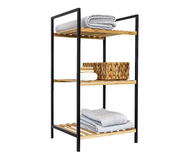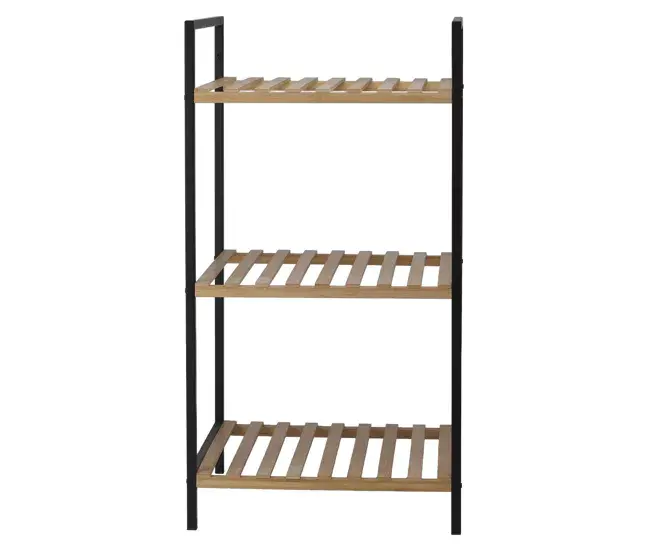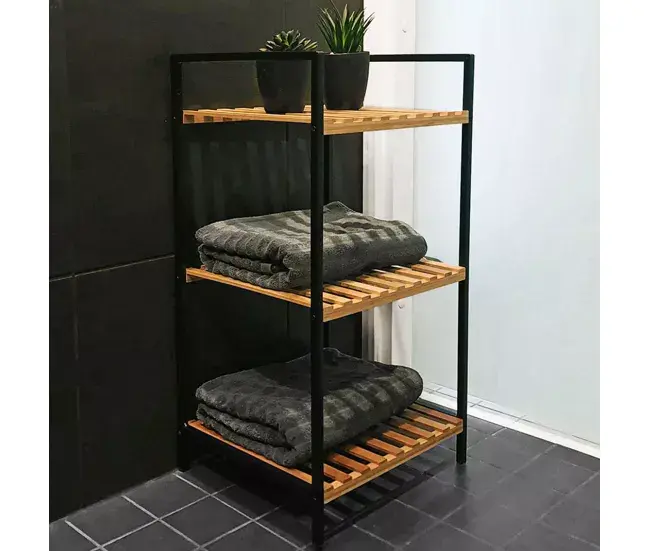 El estante de baño con 3 estantes de bambú FSC 100% enmarcados en metálico negro.La solución perfecta para organizar tus productos de higiene de manera elegante y sostenible. Con dimensiones de 38×32,5x70cm y estantes de 35x33x2cm, este estante ofrece amplitud y resistencia con un espesor de pies de 1,2cm. Es fácil de mover y colocar en cualquier espacio de tu baño.MaterialMadera