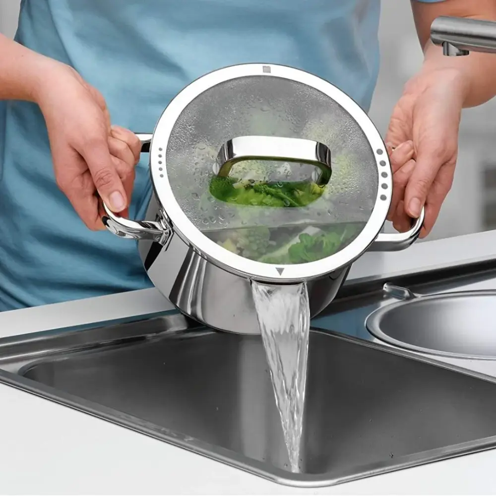 Its heat-resistant handles and its lid with 4 positionsthey will allow you to use this Shallow Casserole for boiling, sautéing, poaching, frying, preparing sauces or roasting, both on the stove and in the oven*, even with its lid, which lets you drain the cooking liquid in 3 of its positions.